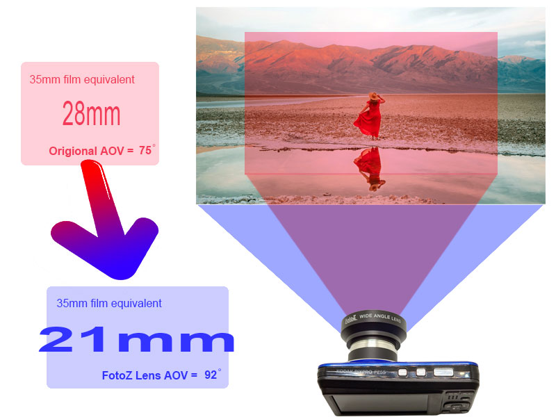 This Lens & Filter is designed for Kodak FZ55 Digital Camera. This Lens provides a 92 degree field of view , converting to ultra wide 21mm from the original focal length of 28mm (35mm equivalent).