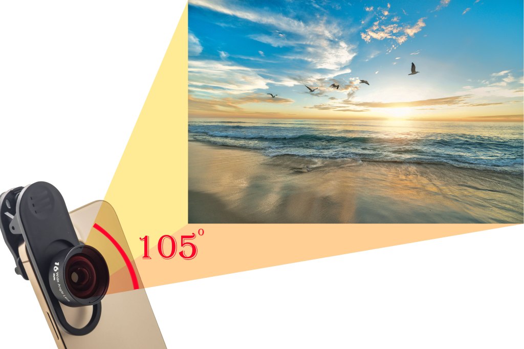 This Wide lens provides a 105 degree field of view , converting to ultra wide 16mm from the original focal length of 24mm (35mm equivalent). It is possible to capture sweeping views with impressive perspective indoors or outdoors.